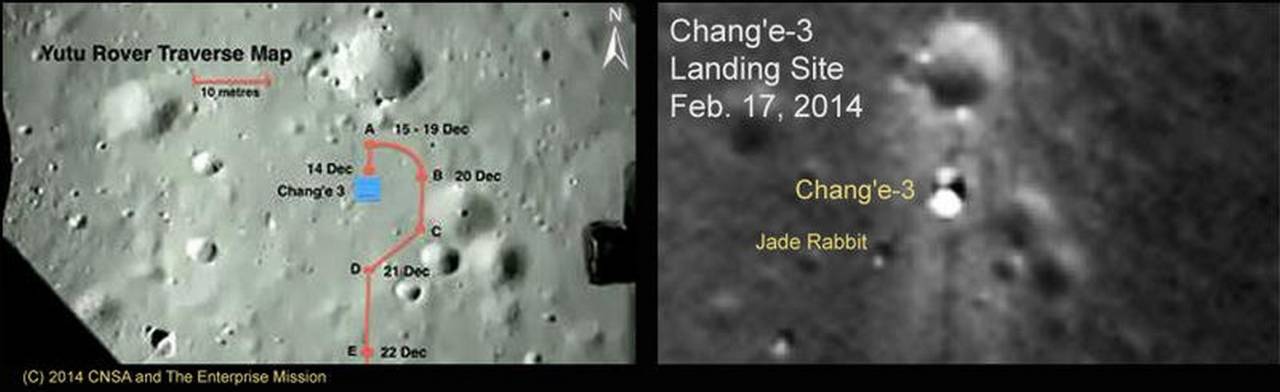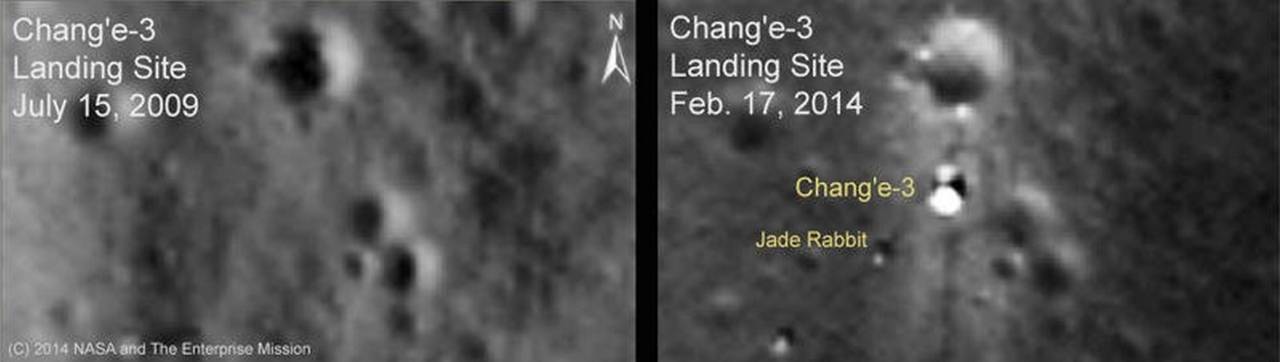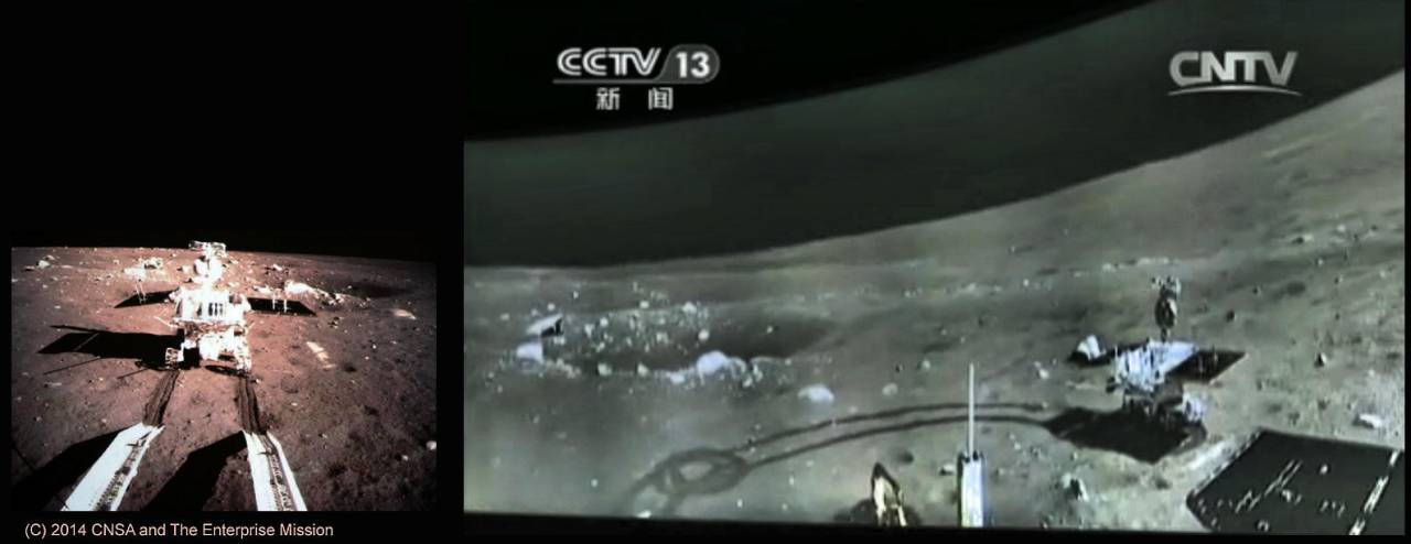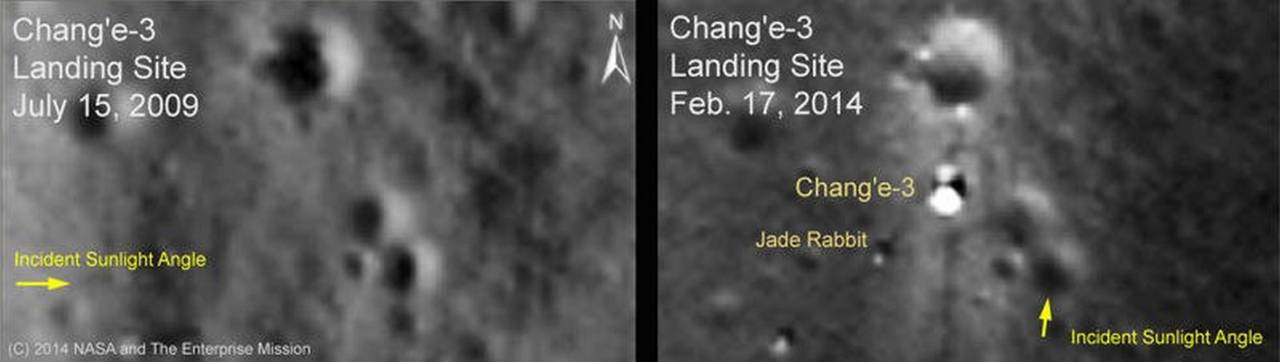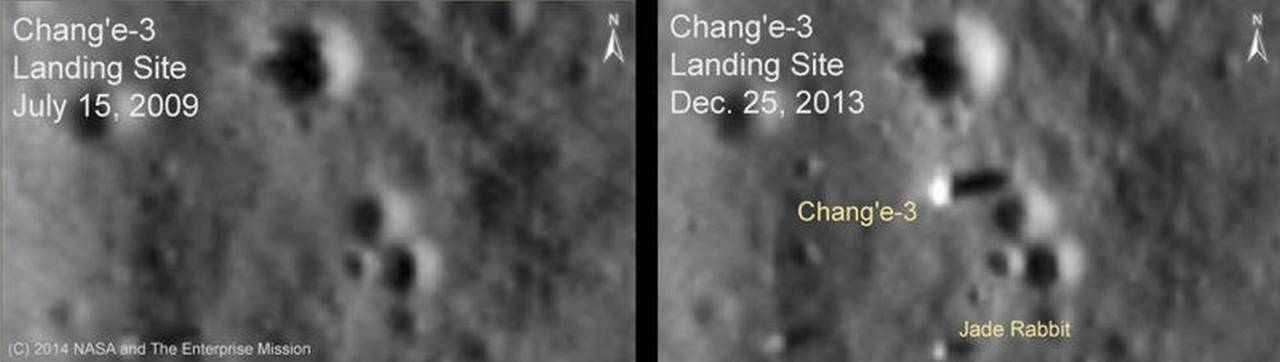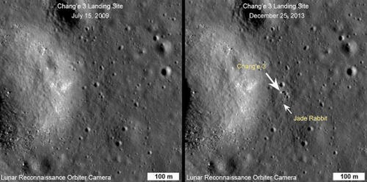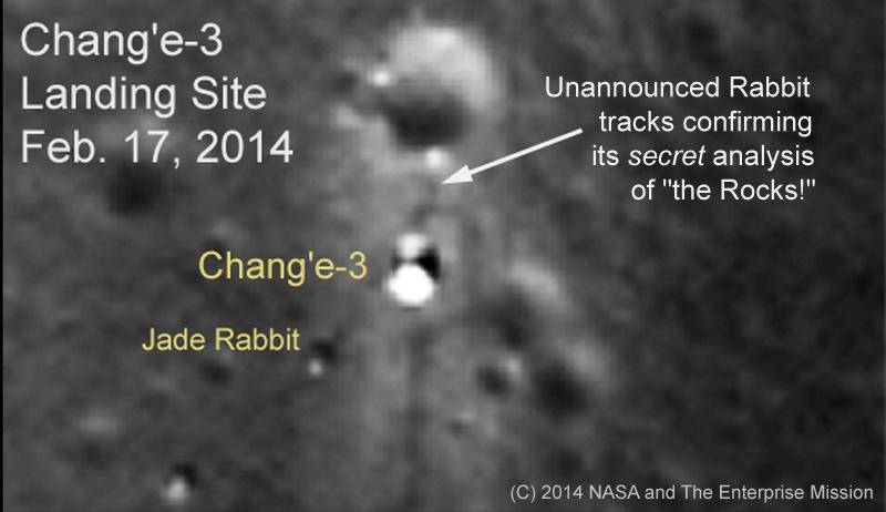 Если немного забежать вперёд в нашем повествовании о «Чанъэ-3», то 25 декабря 2013 года («по совпадению?» — в Рождество) беспилотный лунный разведывательный орбитальный аппарат (LRO) НАСА, который в настоящее время вращается вокруг Луны примерно каждые два часа, начал делать серию снимков с высоким разрешением (с высоты ~90 миль) места посадки «Чанъэ-3» — Чанъэ -3 и Нефритовый Кролик явно видны