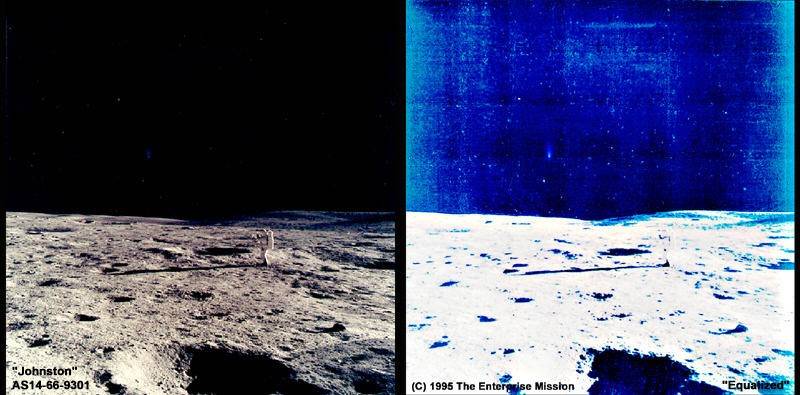 Это был цветной оттиск оригинальной фотографии «Аполлона-14» от Hasselblad (AS14-66-9301 — внизу слева) — бережно сохраненный в «независимом архиве» в течение почти 30 лет бывшим куратором научной фотографии Apollo Кеном Джонстоном (во время прооекта Apollo он работал в Лунной приемной лаборатории NASA в Хьюстоне) — что, начиная с 1995 года, мы нашли наши первые (из многих) цветные, сохраненные НАСА крупные планы «древних лунных куполов»… (фото внизу справа)