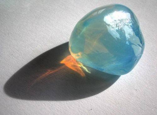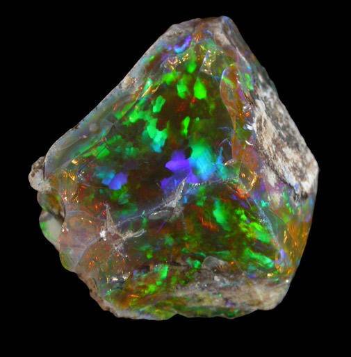 Встречающийся в природе драгоценный камень драгоценный опал, который является источником термина «опалесцирующий», представляет собой вид «аморфного диоксида кремния» (стекла) здесь, на Земле (некоторые камни ценятся дороже, чем алмазы!), содержащий значительный процент воды ; минерал заполнен крошечными, геометрически расположенными кремниевыми сферами, размерами примерно равными размерам видимого света, что приводит у некоторых разновидностей к эффектным дифрагированным спектральным сдвигам (которые геммологи называют «игрой цвета«). при изменении угла обзора (ниже).