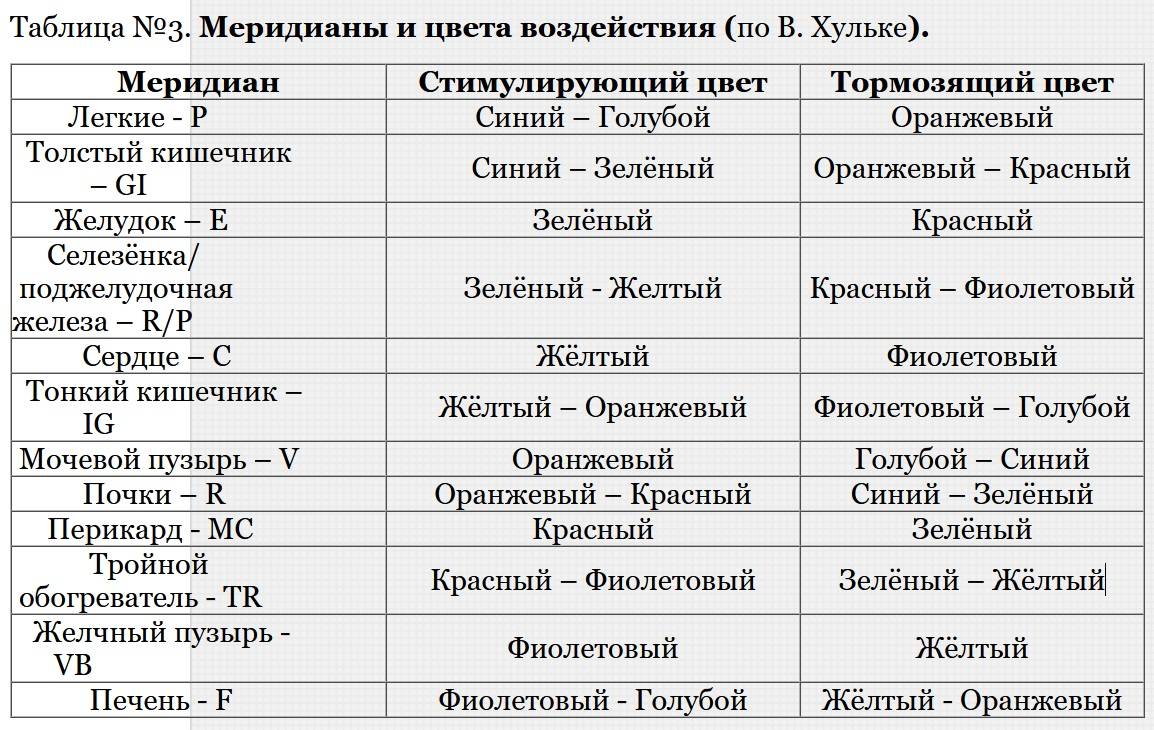 Основные принципы энергетического воздействия цветом на систему меридианов: