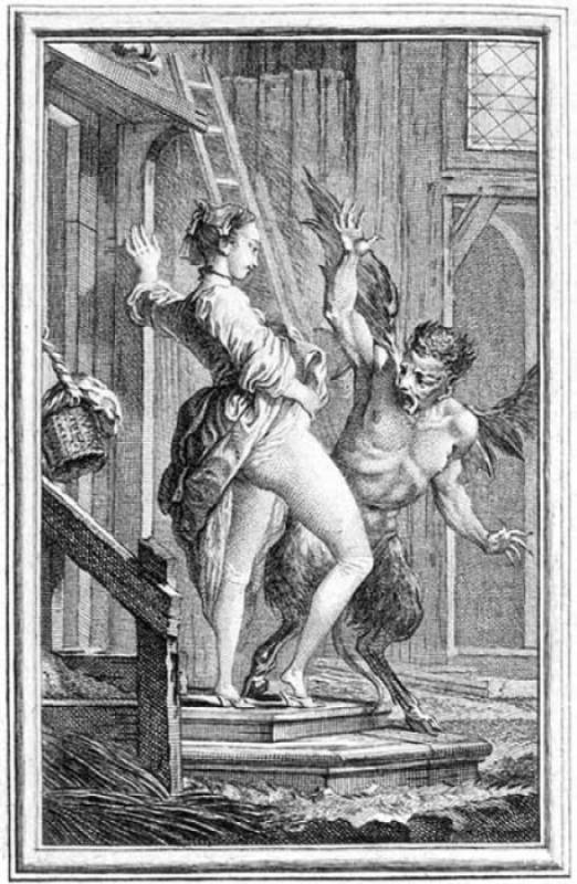 Иллюстрация XVIII века Чарльза Эйзена из “Новых рассказов” Лафонтена (1764), на которой изображен демон, отвращенный видом женщины, поднимающей юбку, чтобы показать свои гениталии. (Шарль Доминик Жозеф Эйзен)