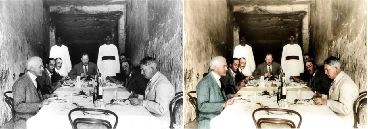Обед в гробнице Рамзеса XI. Фотография сделана лордом Карнарвоном, чьё место во главе стола (впереди) пустует. Среди обедающих (слева направо): Джеймс Генри Брестед (умер от рентгеновского облучения), Гарри Бёртон (умер от диабета), Альфред Лукас, Артур Каллендер (умер от плохого здоровья), Артур Мейс (умер от яда), Говард Картер и Алан Гардинер, все они не старше 50 лет. 16 февраля 1923