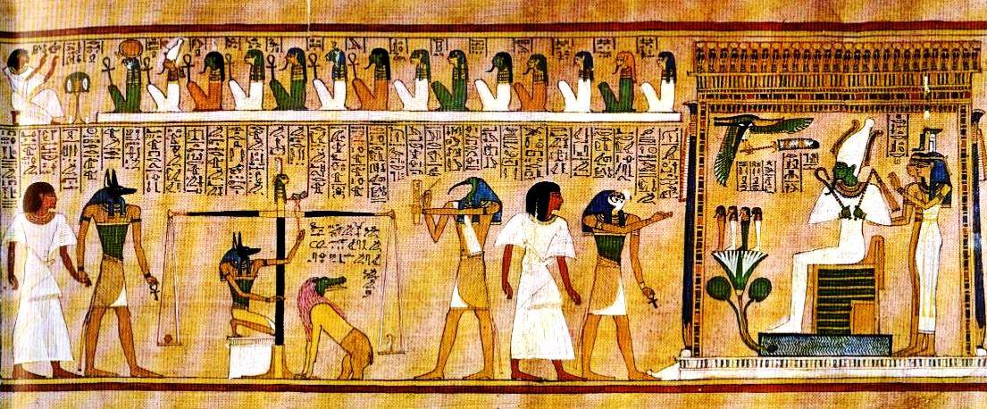 Суд Осириса. Осирис — бог возрождения, царь загробного мира и судья душ усопших в древнеегипетской мифологии.