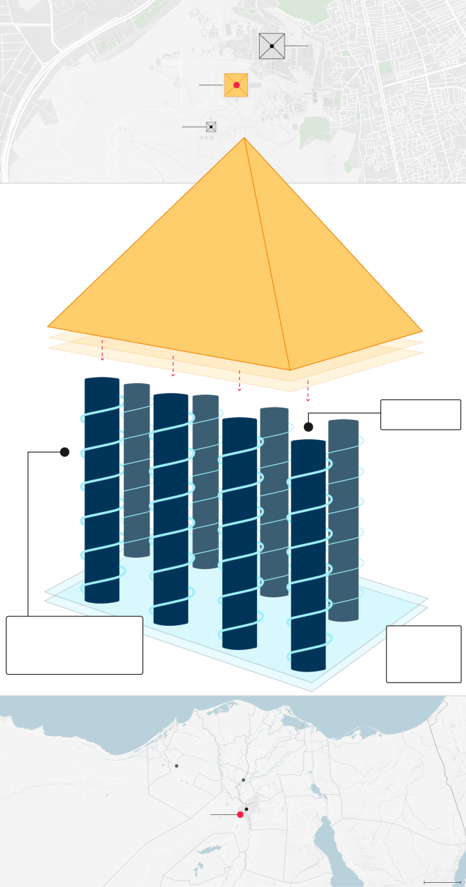 Статья, опубликованная британским таблоидом Daily Mail, возвращается к результатам сканирования плато Гиза группой итальянских ученых. Сканирование было проведено командой проекта Khafre с использованием радара с синтезированной апертурой под руководством Филиппо Бионди. Более 200 сканирований с нескольких спутников, включая итальянский Cosmo-SkyMed и американский Capella Space, показали одинаковые результаты, свидетельствующие о массивных колоннах диаметром около 20 м., закрученных в спирали и погружающихся почти на 1200 м. в глубину. Эти колонны, по-видимому, заканчиваются пространствами под всеми тремя пирамидами и Сфинксом, которые Бионди описывает как «огромные камеры» размером ок. 80 м. в длину и ширину. Снимки показали не только вертикальные сооружения, но и горизонтальные коридоры высотой около 9 футов, которые соединяют шахты и камеры под плато. Бионди датировал подземные сооружения возрастом от 18 000 до 20 000 лет, связывая их с Зеп-Тепи, мифическим временем, когда Египтом правили боги.