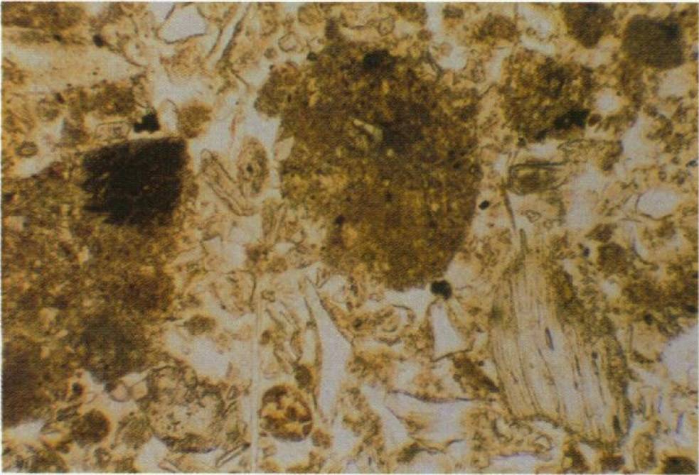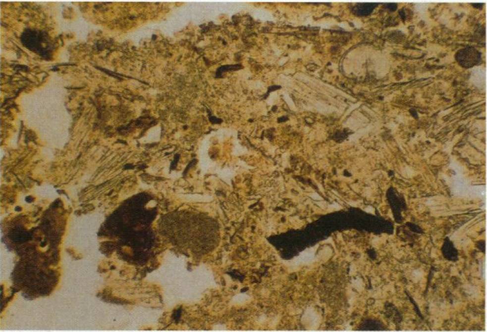 Рис. 6. Обрушение Телль-Лейлана, фаза 1: операция 8, нижняя часть участка 29, геологический образец 203. Известковый ил, богатый мелкофрагментированной тефрой размером с ил, фитолитами, древесным углем и округлыми песчинками желтовато-коричневой и серой известковой почвы, принесенными ветром. Накопление эоловых отложений на верхней части последнего до перерыва в осадконакоплении культурного слоя (Телль-Лейлан IIb) в ходе раскопок 8. Длина — 0,87 мм.