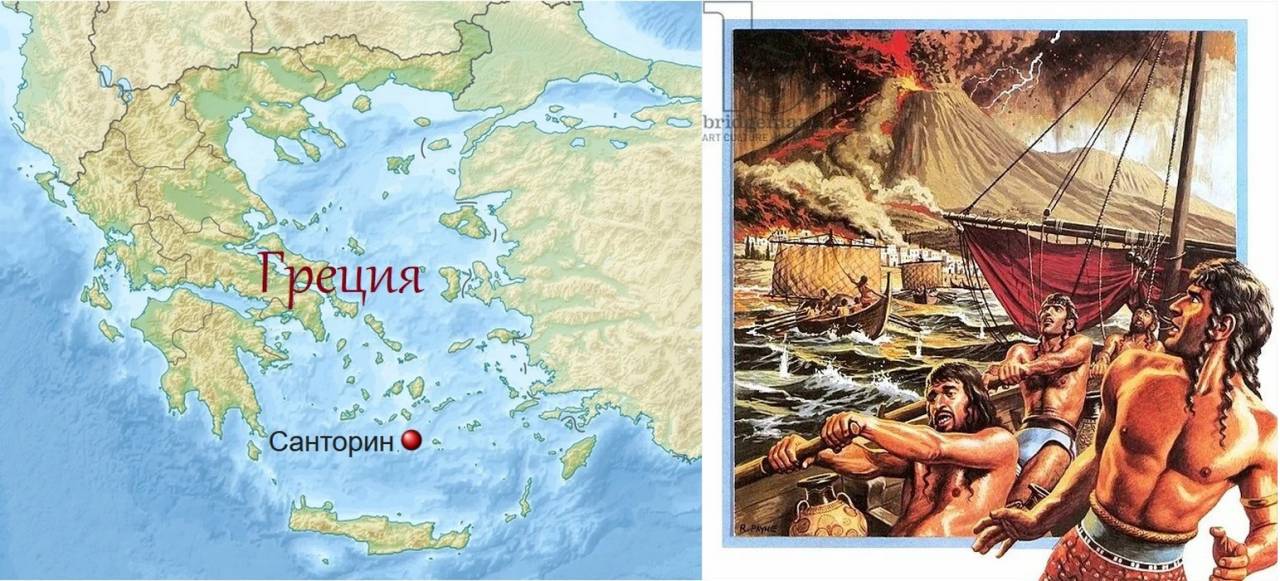Извержение вулкана Санторин (по разным оценкам, датируется 1700–1600 годами до н. э.) привело к гибели эгейских городов и поселений на островах Крит, Тира и побережье Средиземного моря. По мнению учёных, это было не однократное извержение: Санторин, похоже, бушевал около 25 лет подряд