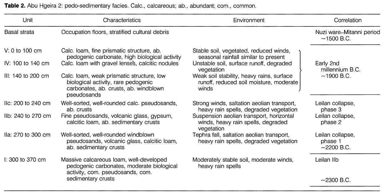 Региональные последствия засушливого периода 2200 г. до н. э. также подтверждаются почвенно-стратиграфическими данными, собранными в Абу-Хгейре 2 (таблица 2) и Абу-Хафуре, в 15 км к северо-западу от Хассеке и в 50 км к юго-западу от Телль-Лейлана.