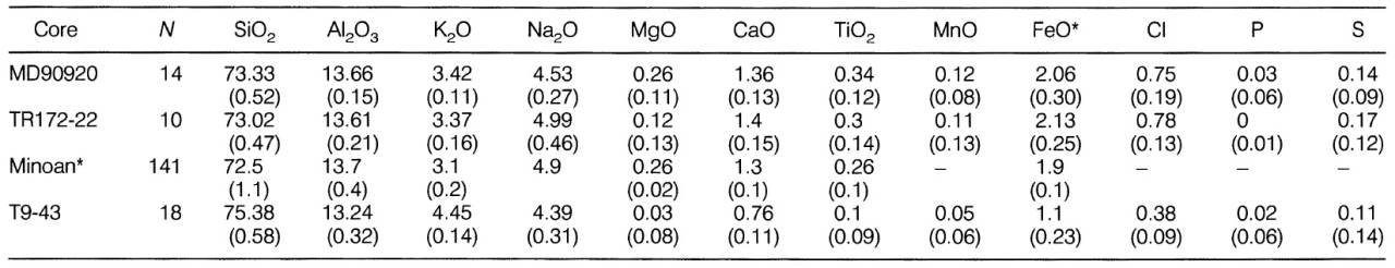 Таблица 3. Содержание основных элементов в минойской тефре в кернах восточного Средиземноморья в весовых процентах. Для MD-90920 (35017,53 с. ш., 28012,46 в. д., глубина 1620 м) образец взят с глубины от 26,5 до 27,5 см, размер осколков стекла составляет от 63 до 250 мкм. F или T RI-172-22, данные из ( 47). «Минойский»* относится к осколкам стекла минойского периода, найденным в морских отложениях (72). T9-43 относится к образцу Абу Хгейра 2. Анализ отдельных осколков стекла проводился с помощью сканирующего электронного микроскопа в сочетании с энергодисперсионным рентгеновским спектрометром (анализ проводился при напряжении 15 кВ, силе тока 0,3 нА на участках площадью от 20 до 50 мм2 в течение 100 секунд). Стандартное отклонение (2() указано в скобках. Общее содержание железа в виде FeO*.